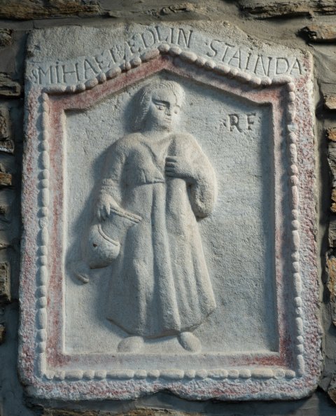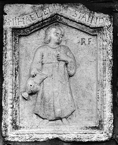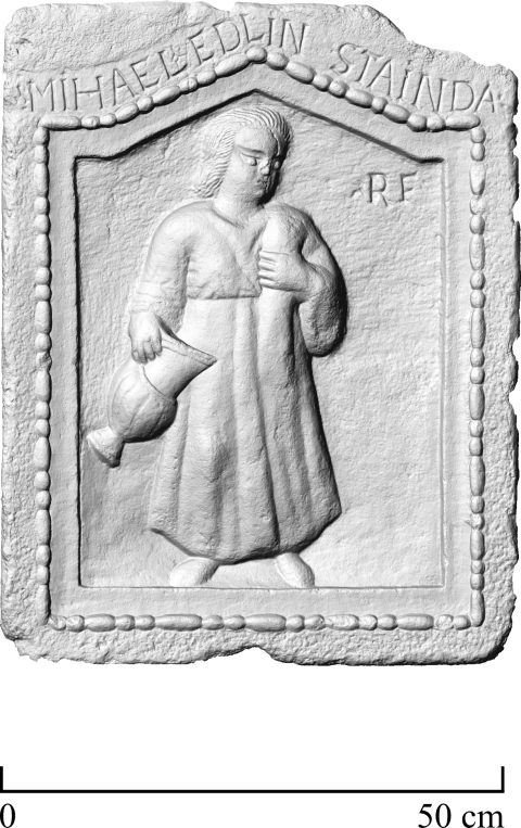 - Dienerin: in gerahmtem Bildfeld mit Giebel einheimisches Mädchen mit gegürtetem Ärmelgewand, in der Rechten Kanne, über der linken Schulter mappa. Perlstab als äußerer Rahmen. 1605 überarbeitet.