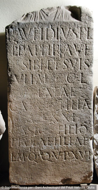 - P(ublius) Aufidius P(ubli) l(ibertus) / Epaphra v(ivus) f(ecit) / sibi et suis / Iuliae C(ai) l(ibertae) / [---]iatae / Cast[a]e filiae / a[n(norum)] XXI / Casto filio / Probae filiae / lib(ertis) lib(ertabus)q(ue) / l(ocus) m(onumenti) q(uo)q(uo)v(ersus) p(edum) XVI