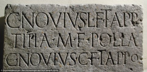 - C(aius) Novius L(uci) f(ilius) Tappo / Titia M(arci) f(ilia) Polla / C(aius) Novius C(ai) f(ilius) Tappo / lib(ertis) libertab(usque) / l(ocus) p(edum) q(uadratorum) XVI