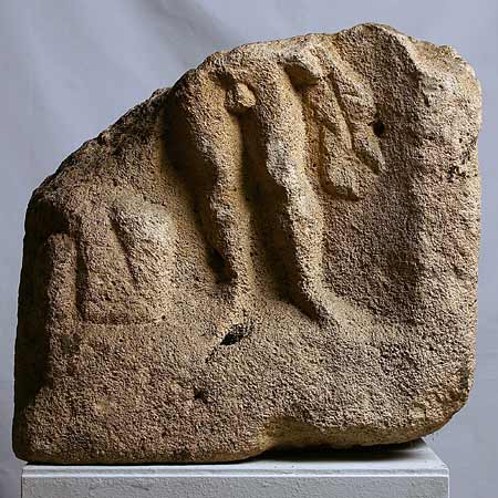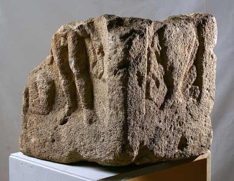 Eckblock. Mann (Soldat), Genius: Auf der Vorderseite zwei Bildfelder übereinander. Oben stehender Mann: kurze Tunica, Gürtel, Sagum, in der Linken Rolle (volumen), neben dem rechten Fuß Rollenbehälter. Unten nackter Genius mit Mantel an der linken Seite. Neben dem rechten Fuß Behälter.