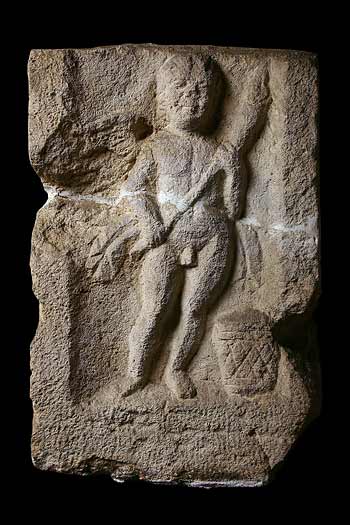 Eckblock: auf der Vorderseite Genius (Erot): nackter geflügelter (?) Knabe mit Mantel, in den Händen Fackel, neben dem linken Fuß Korb mit Deckel.