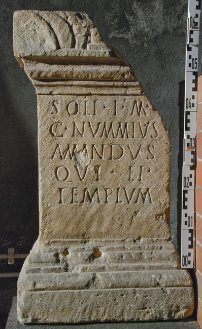 - Soli I(nvicto) M(ithrae) / C(aius) Nummius / Amandus / qui et / templum