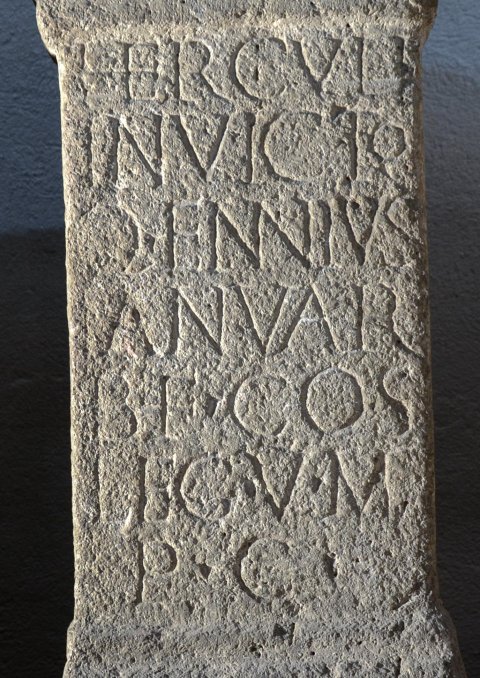 - Herculi / invicto / Q(uintus) Ennius / Ianuar(ius) / b(ene)f(iciarius) co(n)s(ularis) / leg(ionis) V M(acedonicae) / p(onendum) c(uravit)