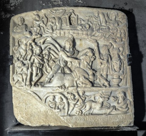 - Mythos (Mithras) : Szenen in drei Registern, im Mittelbild Stiertötung (Tauroktonie). Inschrift auf dem Stier und auf der Sockelleiste.