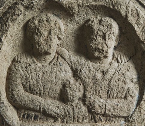 - Auf Säulen mit Spiralkanneluren ruhender profilierter Bogen, der in einen offenen Giebel ragt. Im Bogen Medaillon und Muschelnische mit Brustbildern einer Familie: Ehepaar mit Kind (Knabe). Frau mit Fibeln, bärtiger Mann mit Rolle (volumen). Seitlich des Bogens Delphin.