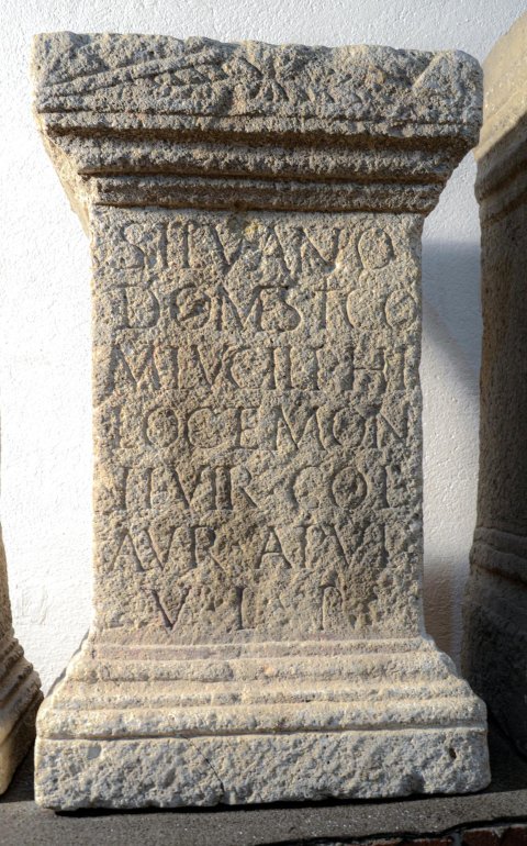 - Silvano / Domestico / M(arcus) Lucil(ius) Philoctemon / IIvir col(oniae) / Aur(eliae) Apul(ensis) / v(oto) l(ibens) p(osuit)