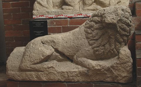 - auf dem halbrunden Abschlussstein einer Mauer (Lorica) liegender Löwe