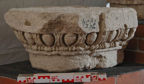 - Dorisches Kapitell eines Pilasters mit vorgelegter Halbsäule. Eierstab und Astragalstab, unten Ansatz des glatten Säulenschaftes.