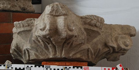 - Fragment eines korinthischen Kapitell mit Akanthusblattkranz, am Abacusrand zwischen den Voluten Zweige.