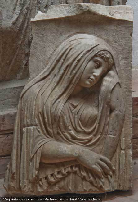 - Oberteil einer stehenden Frauenfigur mit über den Kopf gezogenem Mantel, geneigter Kopf auf die linke Hand gestützt. Attisches Grabrelief, in Aquileia nicht im sepulkralen Kontext verwendet.