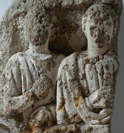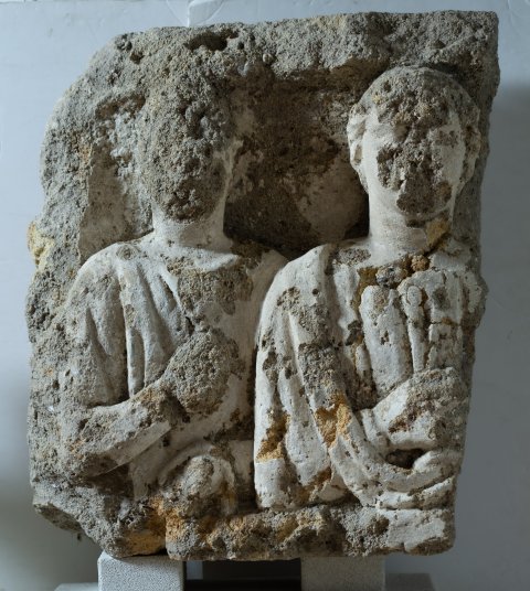 - rechts abgebr., stark bestoßen, Oberfläche stuckiert
