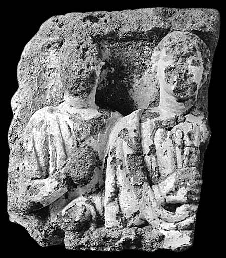 - In Rechtecknische drei Brustbilder einer Familie. Links Jüngling (?) in Tunica, rechts Frau in Tunica und Mantel. Rechts weitere Person(en).