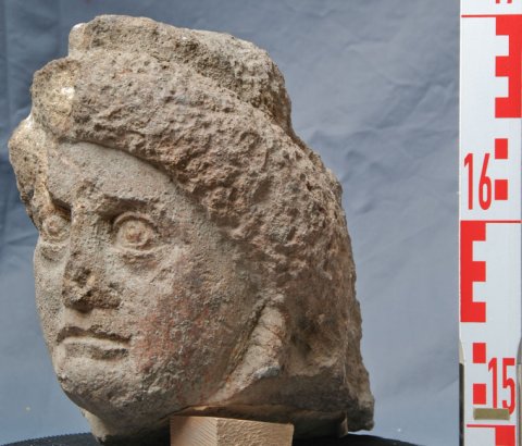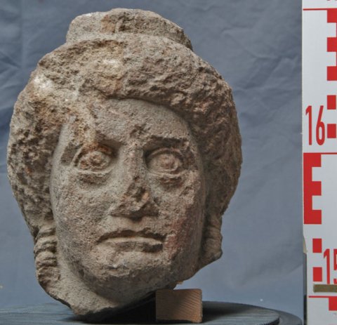 - Kopf einer Frau (Göttin) mit Diadem und gedrehten Schulterlocken. An Hinterkopf und Nacken Rest eines Pfeilers ?