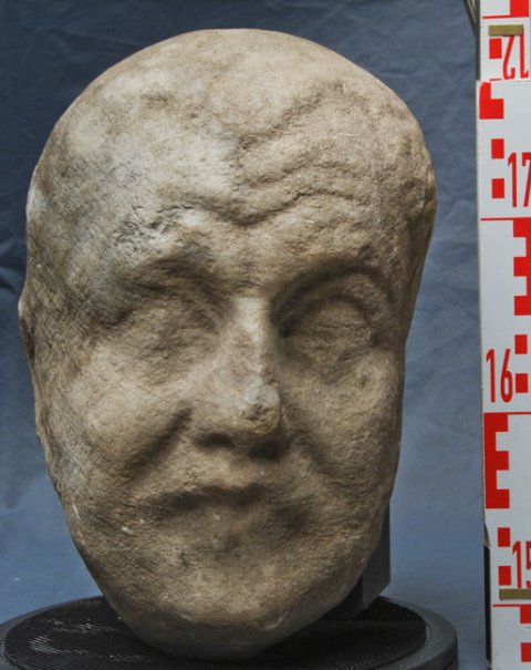 - Kopf eines älteren Mannes mit kurzem Haar und Bart und Stirnfalten