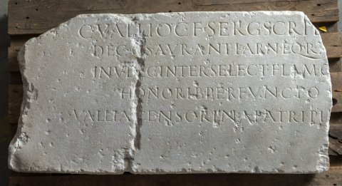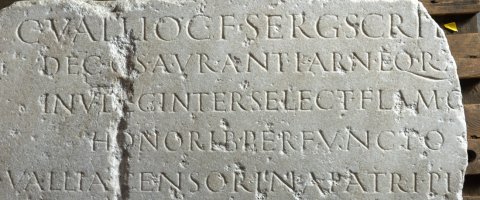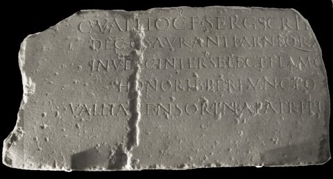 - C(aio) Vallio C(ai) f(ilio) Serg(ia) Scrib[oniano] / dec(urioni) c(oloniae) S(eptimiae) Aur(eliae) Ant(oninianae) Karn(unti) eq(uiti) R(omano) a[dlecto] / in V dec(urias) inter select(os) flam(ini) o[mnibus] / honorib(us) perfuncto / Vallia Censorina patri pii[ssimo]