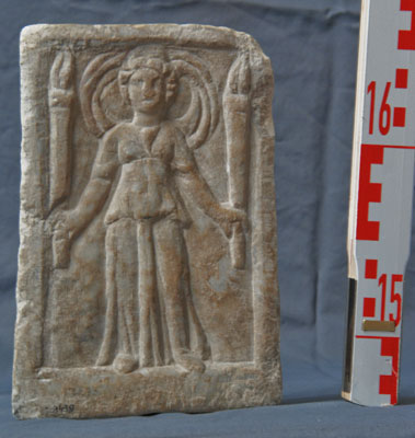 - Mythische Figur: frontal stehende Göttin (Hekate ?) in hoch gegürtetem Chiton, in beiden Händen Fackel, hinter dem Kopf mit Polos sich blähender Mantel.
