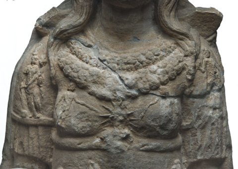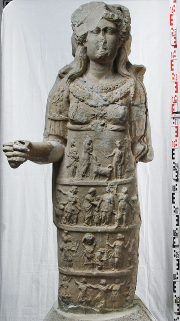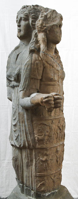 - Mythische Figur: dreileibige Hekate. Zwei Gestalten im hoch gegürteten Chiton, eine mit Reliefschmuck auf dem Gewand und Blütengehängen über der Brust. Auf den Ärmeln je eine Figur, rechts Fortuna mit Füllhorn und Steuerruder, links männliche Gottheit. Auf der Brust Büste des Sol zwischen fackeltragenden Jünglingen. Auf dem Unterkörper Reliefs in vier horizontalen Streifen.
