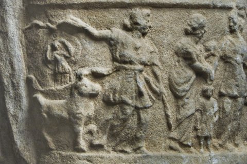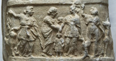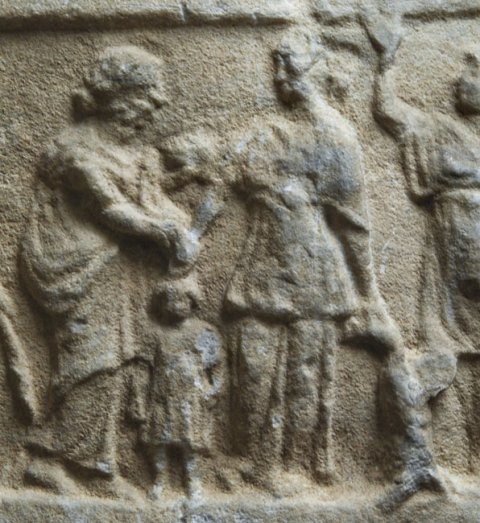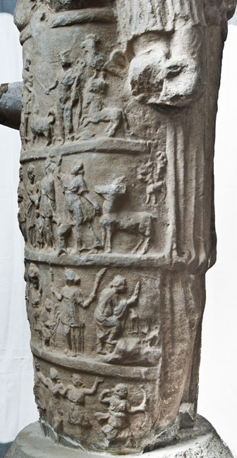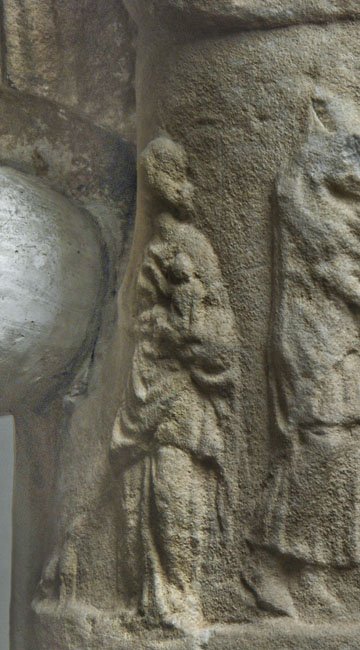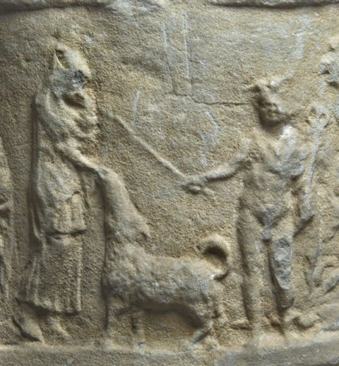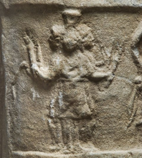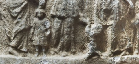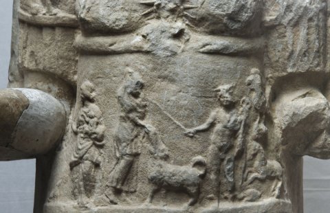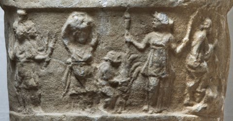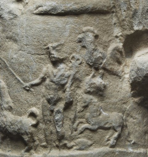 - Mythische Figuren, Mythos: dreileibige Hekate, auf dem Gewand einer Gestalt Reliefszenen in vier Registern.