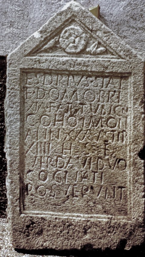 - Esdrius Stai / f(ilius) domo Bri/xia Fab(ia) tubicen / coho(rtis) I Mon(tanorum) / ann(orum) XXXV stip(endiorum) / XIIII h(ic) s(itus) e(st) / Verdavi duo / cognati / posuerunt