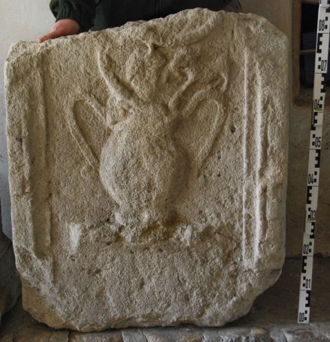 - Gerahmtes Bildfeld, darin zweihenkeliges Gefäß mit Weinranken, auf dem rechten Henkel Tier (Ziege ?).
