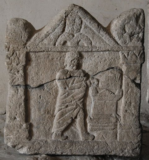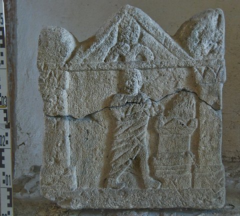 - Giebel mit Blattkelch zwischen Akroteren, Bildfeld zwischen Säulen: Mann im Mantel opfert an einem Altar, auf dem ein Feuer brennt.