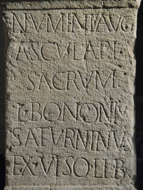 - Numini Aug(usto) / Aesculapi / sacrum / L(ucius) Bononius / Saturninus / ex viso lib(ens)