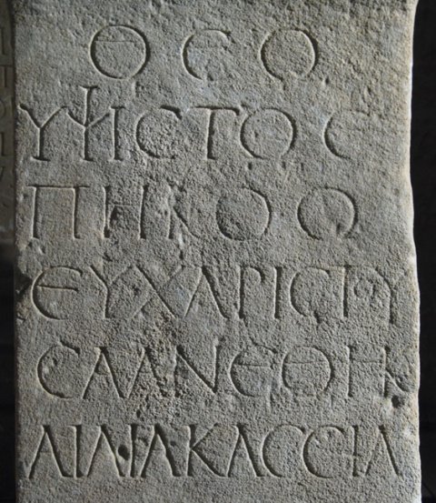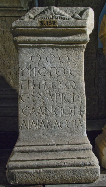 - griech.: Θεῷ / Ὑψίστῳ ἐ/πηκόῳ / εὐχαριστοῦ/σα ἀνέθηκα / Αἰλία Κασσία