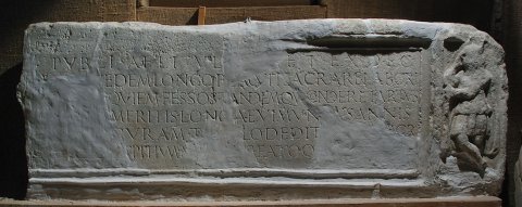- [D(is) M(anibus?)] / Publi Aeli Ulpi vet(erani) ex dec(urione) / hanc sedem longo placuit sacrare labori / hanc requiem fessos tandem qua conderet artus / Ulpius emeritis longaevi muneris annis / ipse suo curam titulo dedit ipse sepulcri / arbiter hospitium membris fatoque paravit