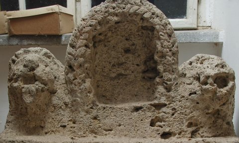 - Liegende Löwen, zwischen ihnen bogenförmige Nische mit Blattdekor auf dem Rand.