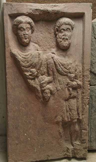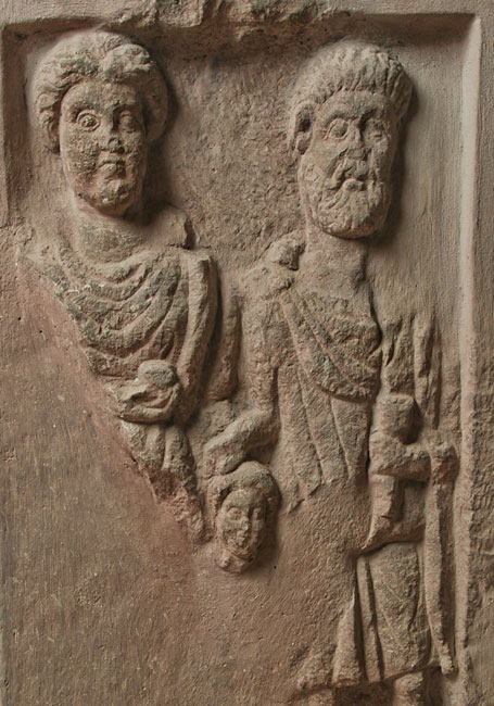 - Rückwand einer Grabaedicula. Stehende Ganzfiguren einer Familie: Frau in Tunica und Mantel, in der Rechten Apfel, bärtiger Mann in kurzer Tunica und Sagum, in der Linken Rolle (volumen), Kind (Mädchen, nur Kopf erhalten).
