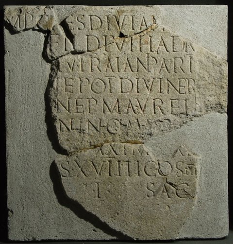 - Imp(eratori) Caes(ari) divi Anto/nini fil(io) divi Hadr(iani) / nep(oti) divi Traiani Part(hici) / pronepoti divi Ner/vae abnep(oti) M(arco) Aurel(io) / Antonino Aug(usto) Arme/niaco Part(hico) max(imo) imp(eratori) II trib(unicia) / potes(tates) XVIIII co(n)s(uli) III / coh(ors) I Sag(ittariorum)