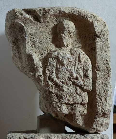 - Diener (Totenopfer ?): unter flachem Bogen Ganzfigur: kurze Tunica, über der Schulter Tuch (mappa), in den Händen Gegenstände. Links weitere Figur, rechts Rahmenleiste.