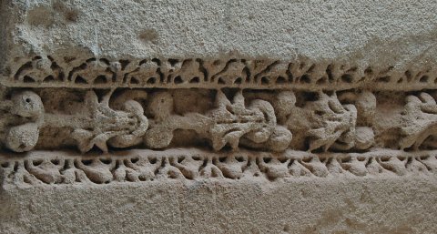 - Auf der Unterseite (?) Soffitte (?) mit kandelaberartiger Blattfries, zu beiden Seiten Kyma. Auf der Vorderseite (?) ähnlicher Fries. Epistyl oder Pfeiler ?