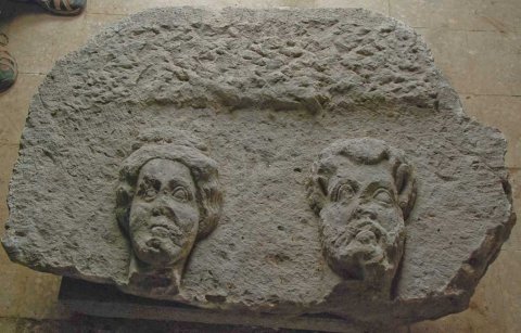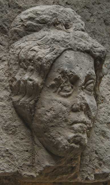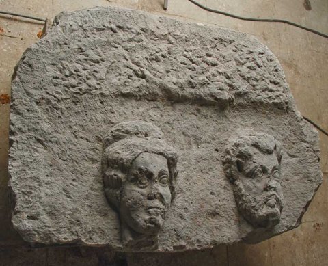 - Rückwand einer Grabaedicula mit zwei Porträtköpfen. Ehepaar: Links Frau mit Frisur der Faustina maior, rechts bärtiger Mann mit gelocktem Haar.
