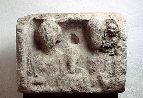 - Familie: in Rechtecknische Brustbilder eines Ehepaares mit Kind. Links einheimische Frau: Haube, Brustschmuck, Umhang, Halsketten, Halsreif mit Lunula. Rechts Mann in Toga, in der Linken Rolle (volumen), vorn Kind.