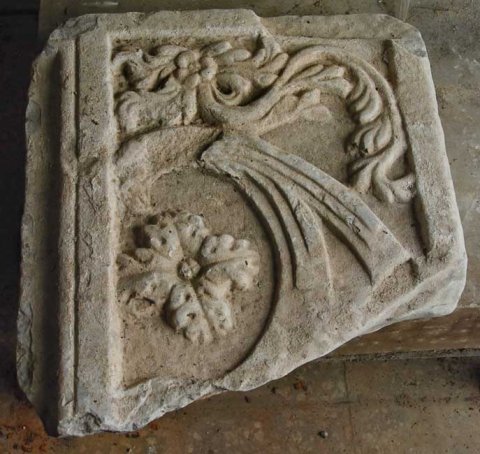 - Gerahmtes Schriftfeld, Seitenfeld mit Peltenschild mit Vogelköpfen, in den Zwickeln Rosetten und Ranken.