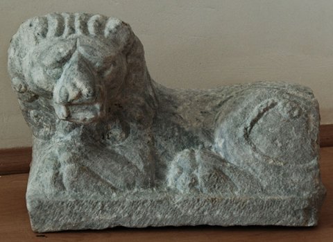 - liegender Löwe mit zur linken Schulter gedrehtem Kopf