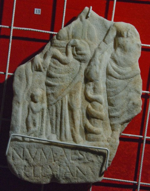 - Mythische Figuren: rechts Aesculap (Asklepios), neben ihm Pfeiler mit Schlange. In der Mitte Hygieia in Chiton und Mantel, eine Schlange fütternd. Neben ihrem rechten Bein nackter Knabe, auf Fackel (?) gelehnt (Telesphorus ?).