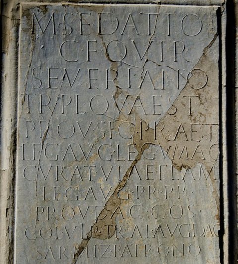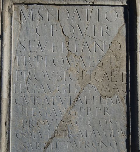 - M(arco) Sedatio / C(ai) f(ilio) Quir(ina) / Severiano / tr(ibuno) pl(ebis) quaest(ori) / prov(inciae) Sic(iliae) praet(ori) / leg(ato) Aug(usti) leg(ionis) V Mac(edonicae) / curat(ori) viae Flam(iniae) / leg(ato) Aug(usti) pr(o) pr(aetore) / prov(inciae) Dac(iae) co(n)s(uli) / col(onia) Ulp(ia) Trai(ana) Aug(usta) Dac(ica) / Sarmiz(egetusa) patrono