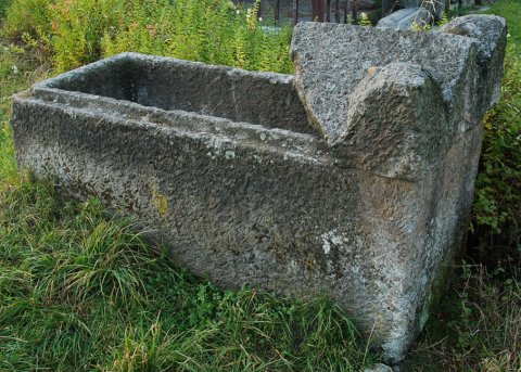 - unverzierter Sarkophag mit dachförmigem Deckel mit Eckakroteren