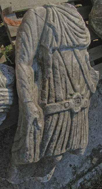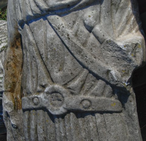 - Stehender Mann (Soldat) in kurzer Tunica, Gürtel mit Ringschnalle, Sagum mit Scheibenfibel, Schwertgurt. Waffen: Schwert im linken Arm.