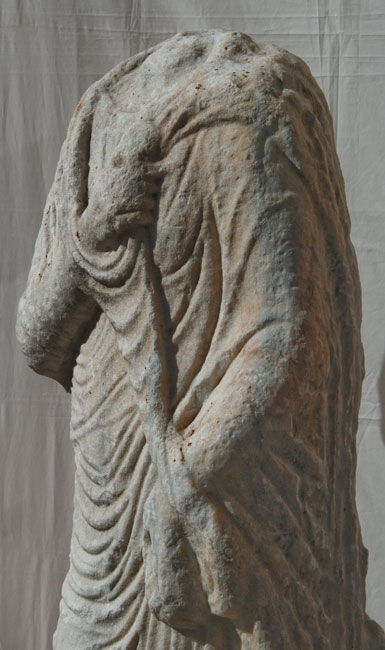 - Kopf abgebr., verwittert, Rückseite löchrig