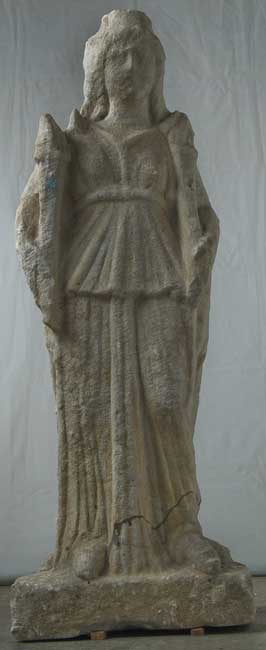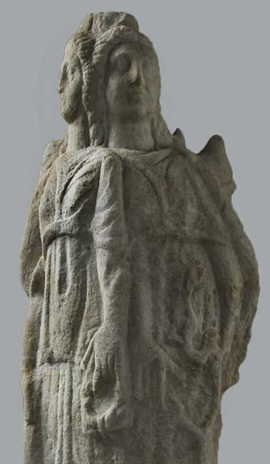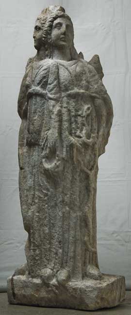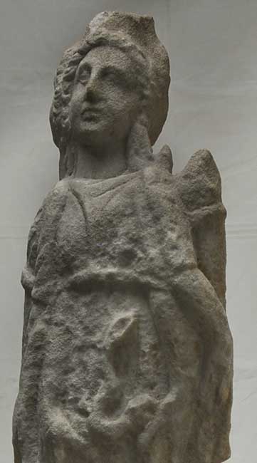 - mythische Figur: dreileibige Hekate mit Fackeln, Kranz, Schlange