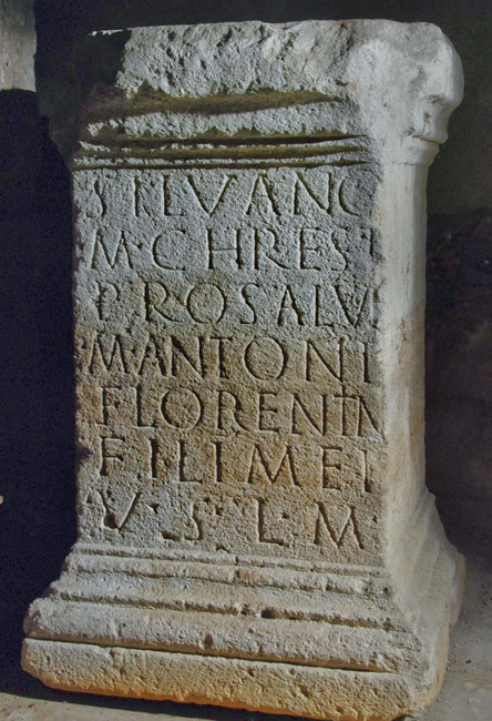 - Silvano / M(arcus) Chrest(us?) / pro salut(e) / M(arci) Antoni(i) / Florentini / fili(i) mei / v(otum) s(olvi) l(ibens) m(erito)