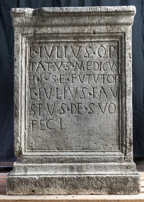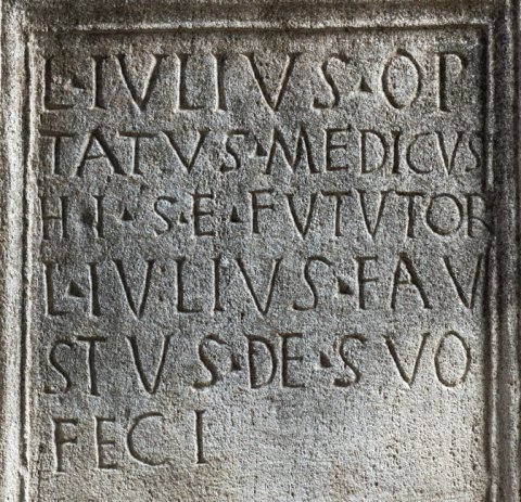 - L(ucius) Iulius Op/tatus medicus / h(ic) i(ntus) s(itus) e(st) fututor / L(ucius) Iulius Fau/stus de suo feci(t)