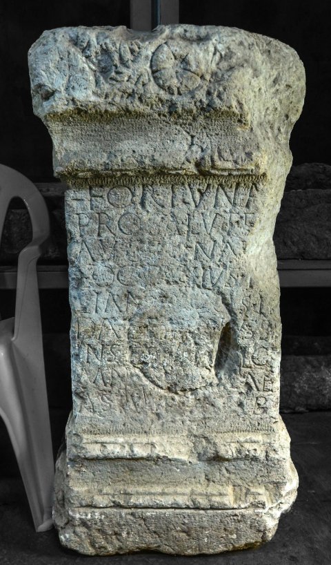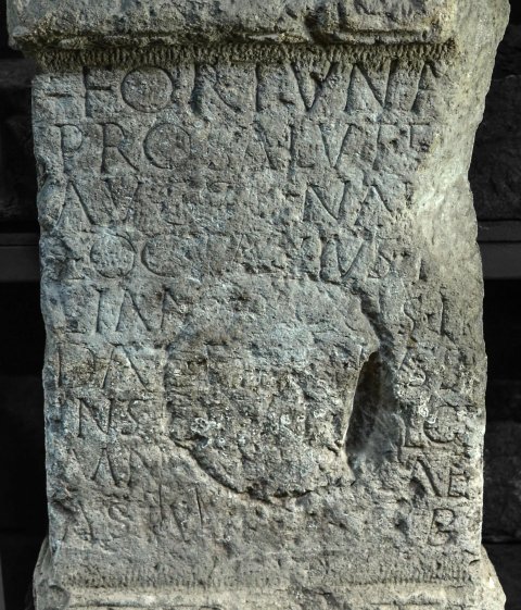 - Fortuna[e] / pro salute / Auggg(ustorum) nn[n](ostrorum) / L(ucius) Octavius I[u]/lianus co(n)s(ularis) II[I] / Dac(iarum) fieri iussit / inst[ante Ae?]l(io) Ge[r?]/man[o? praef(ecto) a]lae / Astu[rum ---]B