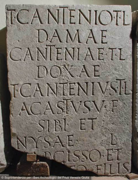 - T(ito) Cantenio T(iti) f(ilio) / Damae / Canteniae T(iti) l(ibertae) / Doxae / T(itus) Cantenius T(iti) l(ibertus) / Acastus v(ivus) f(ecit) / sibi et / Nysae l(ibertis) / Narcisso et / [---]to fili(i)s