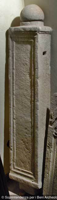 - Vierseitiger Pfeiler mit gerahmtem Schriftfeld auf der Vorderseite, Nebenseiten geglättet mit eckigem Zapfloch. Auf der Oberseite glatter Pinienzapfen.