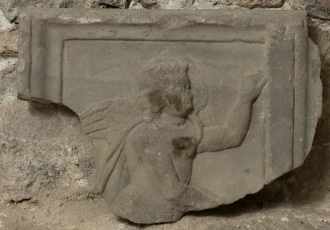 - Linkes Seitenfeld einer Sarkophagfront: Erot (Genius) mit Mäntelchen hält den Rahmen des Schriftfeldes.