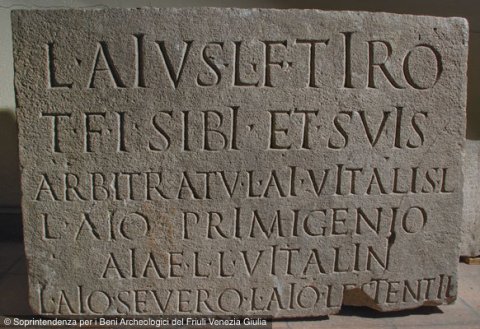 - L(ucius) Aius L(uci) f(ilius) Tiro / t(estamento) f(ieri) i(ussit) sibi et suis / arbitratu L(uci) Ai Vitalis l(iberti) / L(ucio) Aio Primigenio / Aiae L(uci) l(ibertae) Vitalini / L(ucio) Aio Severo L(ucio) Aio L(uci) f(ilio) Stentil(i)
